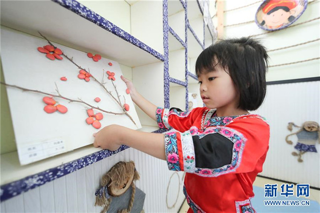 7月2日,在貴州省銅仁市玉屏侗族自治縣,皂角坪幼兒園的小朋友展示自制的綠色環(huán)保作品。 新華社發(fā)(胡攀學攝)