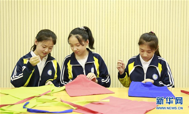 7月2日,河北省廣宗縣第一中學學生手工縫制環(huán)保手提袋。新華社發(fā)(張馳攝)
