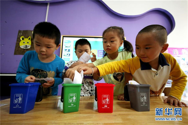 7月2日,在貴州省丹寨縣第三幼兒園,小朋友學習垃圾分類投放。新華社發(fā)(黃曉海攝)