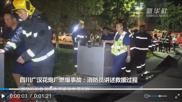 7月8日21時10分左右,廣漢金雁花炮有限責任公司南豐生產(chǎn)區(qū)廠房起火,22時25分引發(fā)燃爆,7月9日凌晨4時20分,事故現(xiàn)場明火全部撲滅。9日下午安排專業(yè)人員和工程車輛進行清障,對庫存的引火線進行轉(zhuǎn)運,徹底消除隱患。
