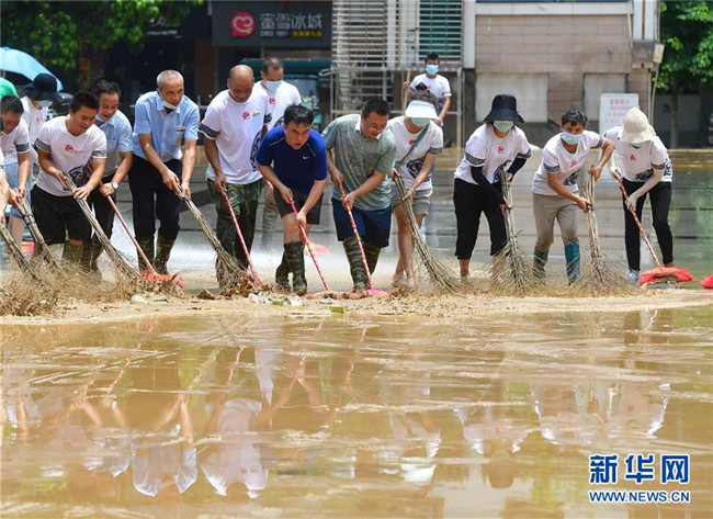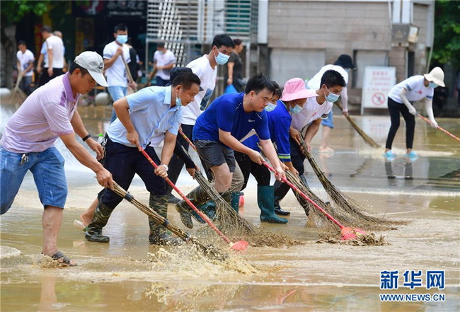 7月12日,融水苗族自治縣文化體育廣電和旅游局清淤小分隊在蘆笙廣場清理地面。 新華社記者 黃孝邦 攝