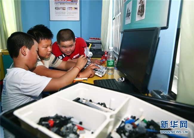 7月22日,學生在石嘴山市大武口區(qū)青少年學生校外活動中心活動室內一起學習組裝機器人。新華社記者 賈浩成 攝