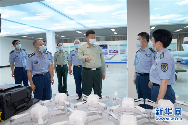 八一建軍節(jié)到來之際,中共中央總書記、國家主席、中央軍委主席習(xí)近平7月23日到空軍航空大學(xué)視察,代表黨中央和中央軍委,向?qū)W校師生員工致以誠摯問候,向全體人民解放軍指戰(zhàn)員、武警部隊(duì)官兵、民兵預(yù)備役人員致以節(jié)日祝賀。這是習(xí)近平察看無人機(jī)操控教學(xué)設(shè)施,了解無人機(jī)操控員培養(yǎng)情況。 新華社記者 李剛 攝