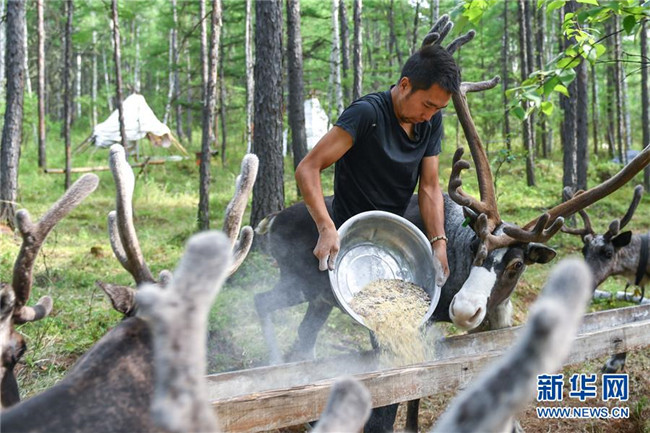 古木森在根河市烏力庫瑪林場內(nèi)的馴鹿放養(yǎng)點喂馴鹿(7月13日攝)。 新華社記者 貝赫 攝