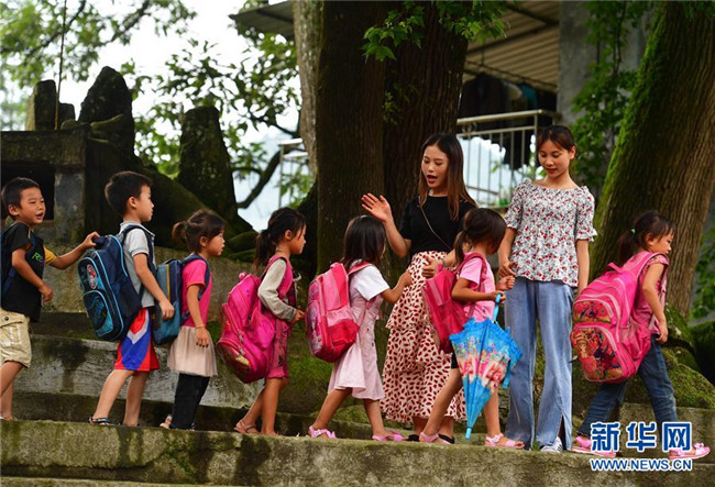 在烏英苗寨教學(xué)點(diǎn),桿洞鄉(xiāng)中心校老師韋春蘭(后排左)和孩子們告別(7月1日攝)。桿洞鄉(xiāng)中心校近期開(kāi)展送教到烏英活動(dòng),定期到教學(xué)點(diǎn)開(kāi)展送教工作。 新華社記者 黃孝邦 攝