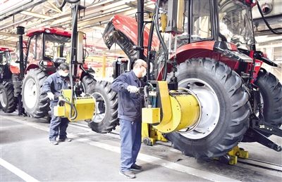 中國(guó)一拖員工在總裝車間流水線上作業(yè)。記者 李嘉南 攝
