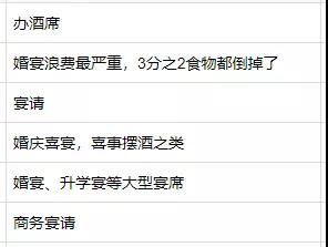 有分析認為,大型餐館聚會、宴請較多,而一般桌餐、團體用餐常以“N+1”“N+2”的方式點菜,即菜量比人數(shù)多1到2個,這類消費更加注重“面子”而非“肚子”,人均浪費量也相對較高,達到驚人的38%。并且,聚餐往往伴隨著酒水飲用,減少了其他食物的食用,也使食物浪費現(xiàn)象更加嚴重。