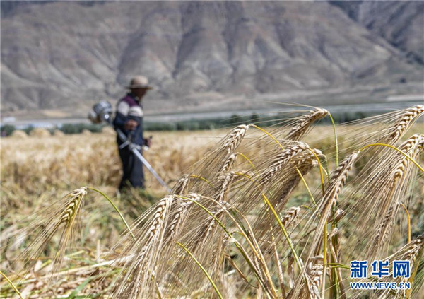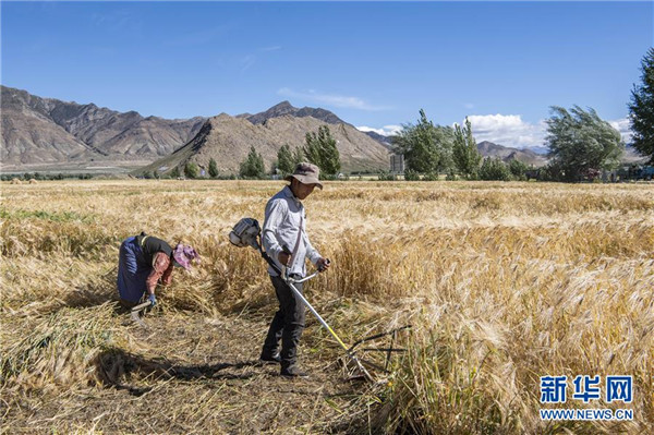 8月29日,農民在日喀則市江孜縣的青稞田里忙收割。日喀則是西藏重要的商品糧基地,被譽為“西藏糧倉”。當前正值青稞收獲季節(jié),當地農民抓緊收割,農田里一片繁忙景象。新華社記者孫非攝