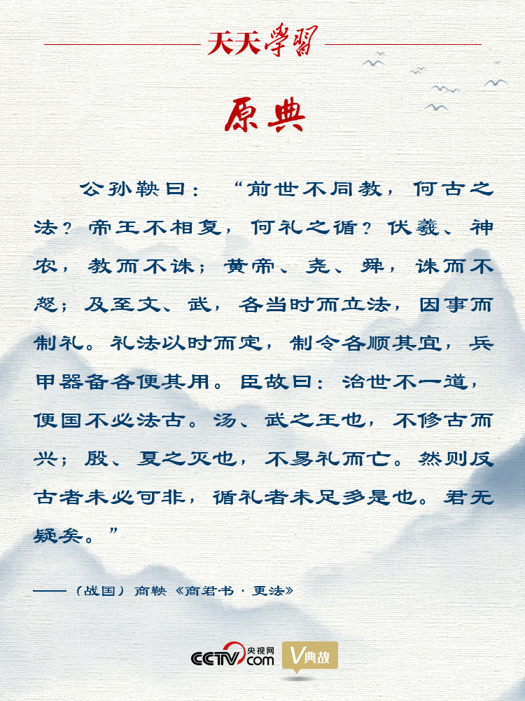 在當(dāng)時(shí),秦國(guó)在戰(zhàn)國(guó)七雄中實(shí)力最弱,不僅受其他六國(guó)輕視,而且被拒之于盟會(huì)之外。秦國(guó)內(nèi)部,由于貴族政治和君主的沖突,大權(quán)旁落在亂臣之手;在外部,鄰國(guó)魏國(guó)由于最早變法,國(guó)力日強(qiáng),經(jīng)常侵奪秦國(guó)領(lǐng)土。秦孝公繼位后決心圖強(qiáng)改革,便向社會(huì)公開(kāi)招賢。衛(wèi)國(guó)人商鞅(原名公孫鞅)所獻(xiàn)的改革方略得到秦孝公的稱許,卻遭到舊貴族的強(qiáng)烈反對(duì)。他們提出圣人不改變民風(fēng)民俗就能施行教化,智者不改變舊法就能治理國(guó)家,堅(jiān)持認(rèn)為“法古無(wú)過(guò),循禮無(wú)邪”。商鞅針?shù)h相對(duì)地指出,夏、商、周三代的禮制不同,但都成就了王業(yè);春秋五霸的法度也各不相同,但都成就了霸業(yè),必須“不法其故”“不循其禮”,這樣才能夠?qū)崿F(xiàn)強(qiáng)國(guó)富民的目標(biāo)。他提出了“治世不一道,便國(guó)不必法古”的主張,意思是治理國(guó)家不一定用一種方略,只要對(duì)國(guó)家有利就不一定非要效法古代。這堅(jiān)定了秦孝公改革的決心,由此開(kāi)始了彪炳史冊(cè)的商鞅變法,秦國(guó)逐漸走向富強(qiáng)。