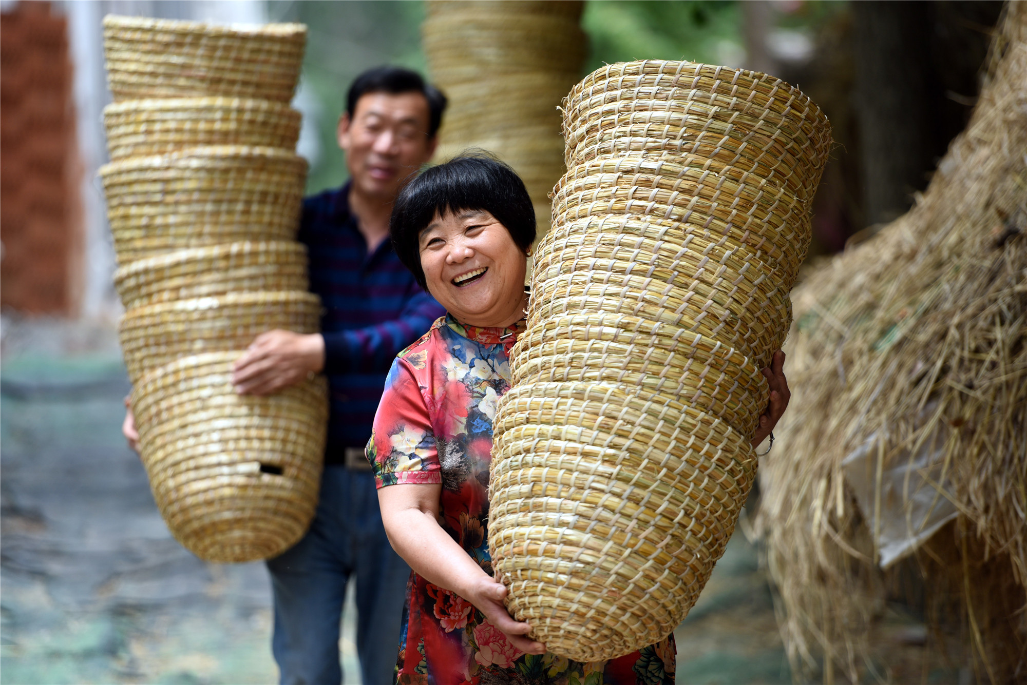 山東省臨沂市郯城縣馬頭鎮(zhèn)草編合作社社員在搬運用秸稈編制的工藝品(2019年5月28日攝)。新華社發(fā)(房德華 攝)