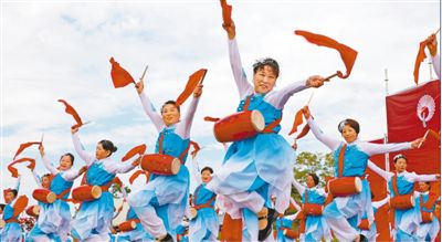 山東榮成市民文化活動公園,1000多名當(dāng)?shù)厝罕娗闷鹧?,共同抒發(fā)走向全面小康生活的幸福與美好。 |