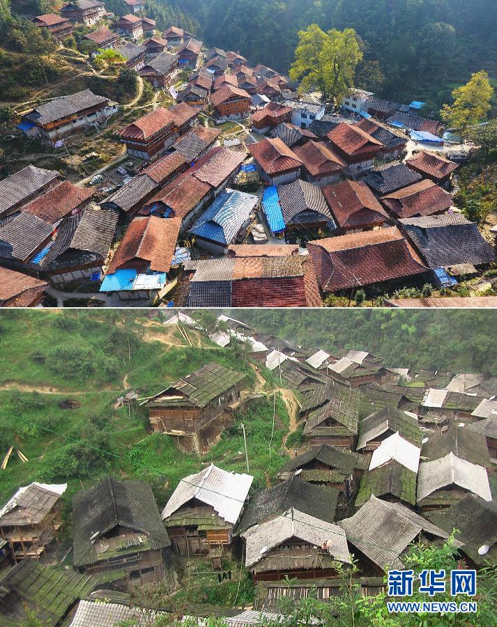 這是一張拼版照片,上圖為:2019年3月20日拍攝的烏英苗寨(無人機照片,新華社記者黃孝邦攝);下圖為:2008年9月7日拍攝的烏英苗寨(資料照片)。新華社發(fā)