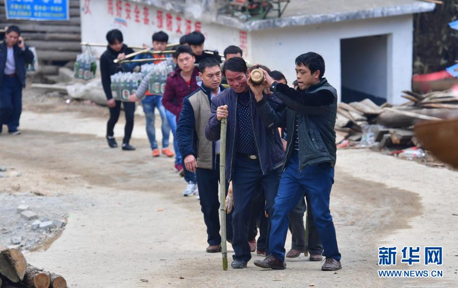 在烏英苗寨,梁秀平(右二)和群眾抬賀禮去參加喜宴(2018年2月18日攝)。新華社記者 黃孝邦 攝
