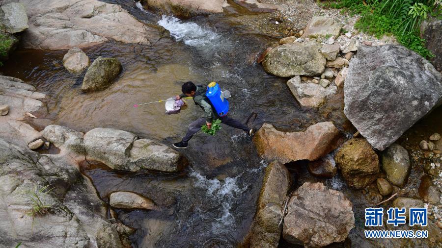 烏英苗寨水果種植專業(yè)合作社負責人梁秀前過河去除草(2019年7月25日攝)。新華社記者 黃孝邦 攝