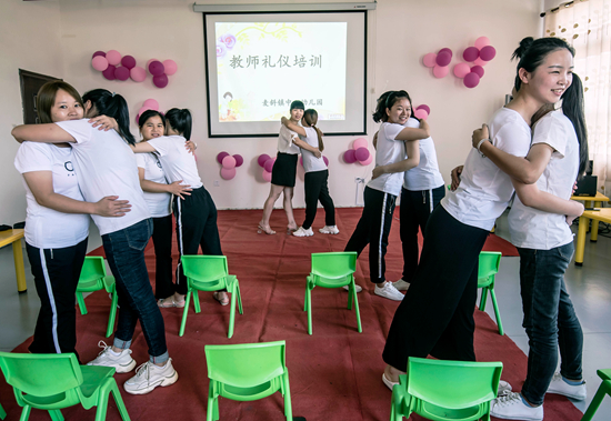 9月9日,江西省吉安市新干縣麥鎮(zhèn)中心幼兒園支教老師鄒小琳(左五)正在對該園幼教老師進行禮儀培訓(xùn)。視覺中國供圖