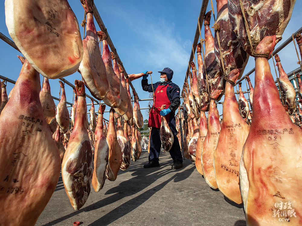 △1月10日,浙江金華某火腿加工區(qū)整整齊齊吊曬著上萬(wàn)只火腿。
