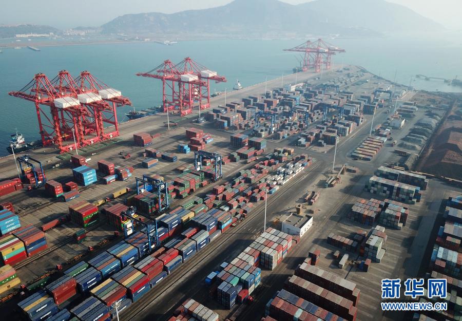 這是1月14日在江蘇連云港港拍攝的集裝箱碼頭(無(wú)人機(jī)照片)。新華社發(fā)(耿玉和 攝)