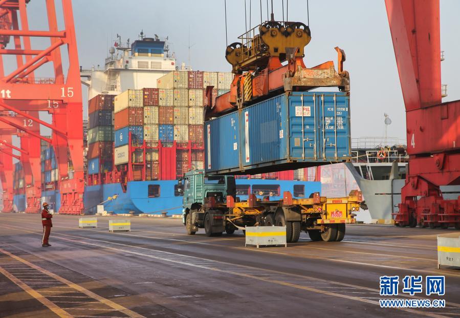 1月14日,在江蘇連云港港集裝箱碼頭,大型機(jī)械從集裝箱船舶上卸載貨物。新華社發(fā)(王健民 攝)