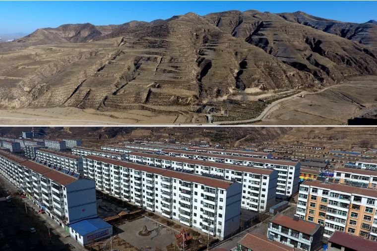 ↑上圖:已被拆除復(fù)墾的山西省岢嵐縣趙家洼村(2018年2月12日攝);下圖:岢嵐縣廣惠園新村一角(無人機(jī)照片,2018年2月13日攝)。趙家洼村曾是呂梁山集中連片特困地區(qū)的深度貧困村,村里只有900畝貧瘠的坡上旱地,生存條件十分惡劣。2017年,趙家洼村易地搬遷全部完成。位于岢嵐縣城的廣惠園移民新區(qū),成為村民們的新家。這里學(xué)校、幼兒園、醫(yī)院、休閑小廣場應(yīng)有盡有,百姓們的日子越過越敞亮。