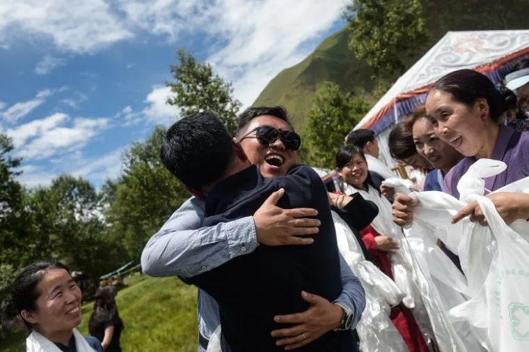 ↑在西藏拉薩市達(dá)孜區(qū),北京大學(xué)腫瘤醫(yī)院的援藏醫(yī)生袁燦(戴墨鏡者)與送別的藏族同事?lián)肀В?020年8月1日攝)。2015年以來,北京援藏醫(yī)療隊(duì)以“組團(tuán)式”醫(yī)療援藏為抓手,幫助拉薩市人民醫(yī)院新建了急診科、重癥醫(yī)學(xué)科等12個(gè)學(xué)科,推動(dòng)當(dāng)?shù)蒯t(yī)療事業(yè)發(fā)生格局性變化。如今,“組團(tuán)式”醫(yī)療援助已經(jīng)成為北京在助力脫貧攻堅(jiān)戰(zhàn)中一張閃亮的名片。