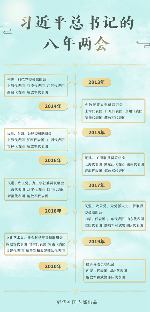 2013-2020,八年的全國兩會上,總書記46次到團(tuán)組參加審議討論。交流之中,語重心長;言談之間,發(fā)人深思。