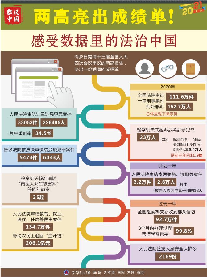 8日提請十三屆全國人大四次會議審議的兩高報告,交出一份滿滿的成績單。掃黑除惡“打傘破網(wǎng)”、嚴(yán)懲腐敗守護平安、加強民生司法保障……一串串?dāng)?shù)字勾勒出法治中國建設(shè)的亮點。