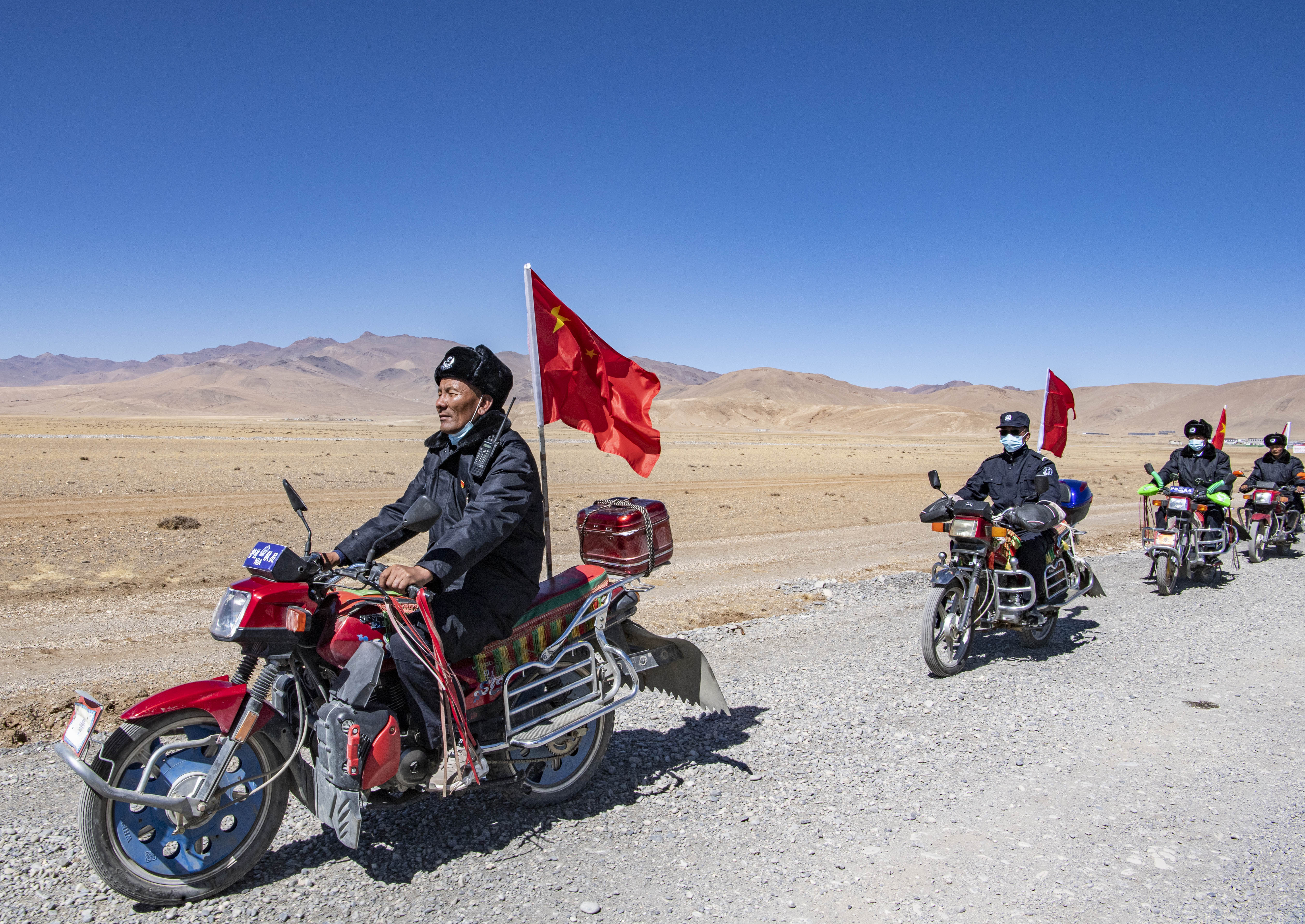 西藏日喀則市薩嘎縣昌果鄉(xiāng)的一處村莊里,48歲的藏族漢子石覺塔布在風(fēng)中跨上一輛摩托車,向平坦無垠的高原邊緣騎去。車尾,一面五星紅旗被風(fēng)吹得獵獵作響。