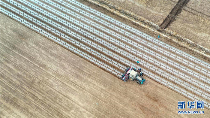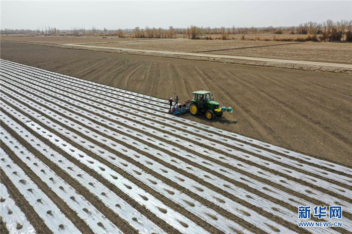 新疆喀什地區(qū)巴楚縣農(nóng)民在使用機(jī)械進(jìn)行春播(3月28日攝,無(wú)人機(jī)照片)。新華社記者 馬鍇 攝