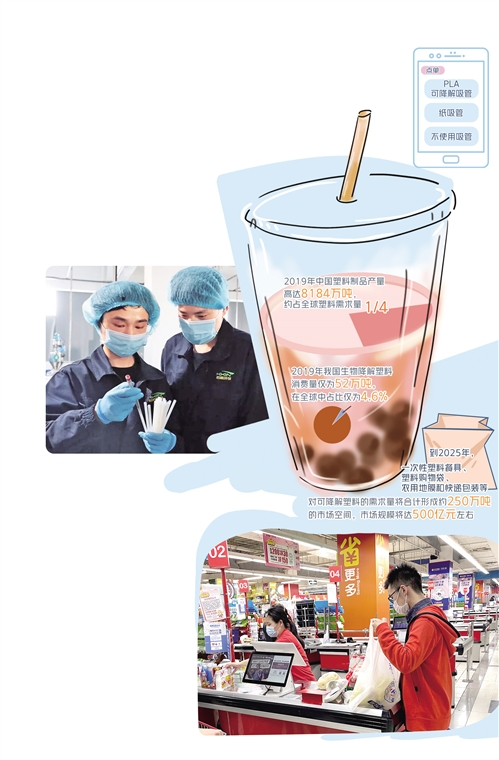 記者在北京采訪時發(fā)現(xiàn),眾多大型連鎖商超已全面更換可降解塑料袋,不少大型連鎖餐飲企業(yè)也陸續(xù)淘汰過去常用的一次性塑料包裝盒與吸管等用品,更換為紙質(zhì)或其他可降解材料替代品。