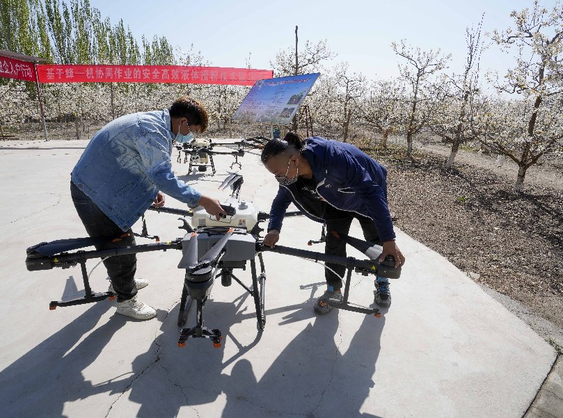 在新疆南疆等地,梨樹花期很短,且往往伴隨沙塵天氣,梨樹授粉作為梨產(chǎn)業(yè)發(fā)展中最為關(guān)鍵的一環(huán),以往通過人工授粉或者蜜蜂授粉進行。隨著人工成本不斷增加以及產(chǎn)業(yè)健康發(fā)展需要,以蜜蜂采集的高活性授粉用花粉聯(lián)合無人機噴施的蜂機協(xié)同作業(yè)高效液體授粉技術(shù)開始出現(xiàn)。