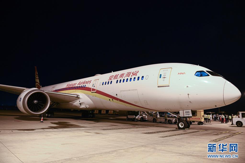 這是3月26日在??诿捞m國際機場拍攝的海南航空HU787航班。3月27日凌晨,該航班搭載貨物從海口飛往法國巴黎,海南自貿港首條定期洲際貨運航線正式開通。新華社記者 蒲曉旭 攝