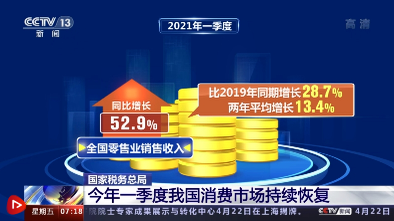 央視網(wǎng)消息:國家稅務(wù)總局?jǐn)?shù)據(jù)顯示,一季度,我國零售業(yè)銷售收入兩年平均增長超10%,消費(fèi)市場持續(xù)恢復(fù)。