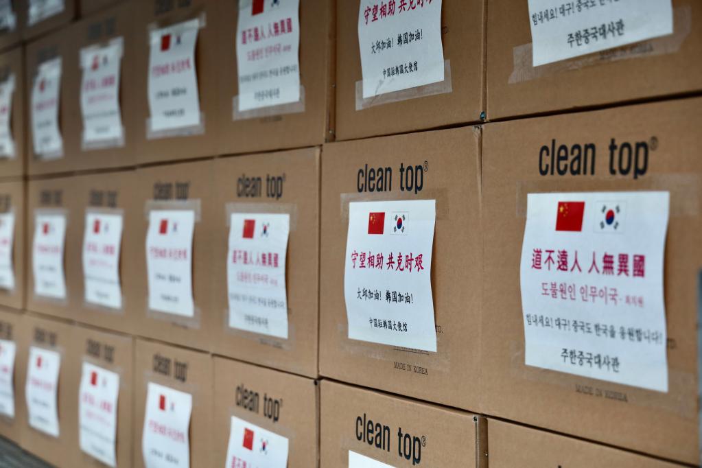 2020年2月27日,在韓國首爾,中國駐韓國大使館緊急籌備的醫(yī)用口罩準備運往大邱。箱子外包裝上寫著:“道不遠人 人無異國”“守望相助 共克時艱”等支持的話語。