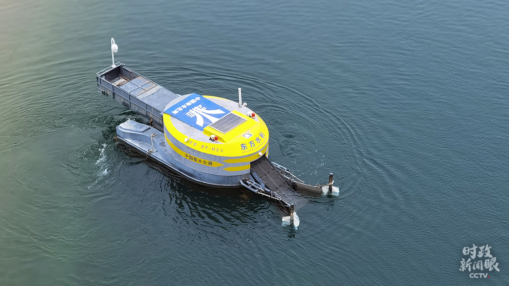 △形似小船的清漂機(jī)器人自帶攝像頭,能自動(dòng)尋找水面垃圾。(總臺(tái)央視記者馬立飛拍攝)