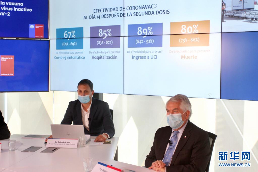 4月16日,智利衛(wèi)生部長(zhǎng)帕里斯(右)與智利衛(wèi)生部顧問阿勞斯在圣地亞哥出席發(fā)布會(huì),公布中國(guó)科興新冠疫苗保護(hù)效果在該國(guó)的真實(shí)世界研究結(jié)果。新華社發(fā)(智利衛(wèi)生部供圖)