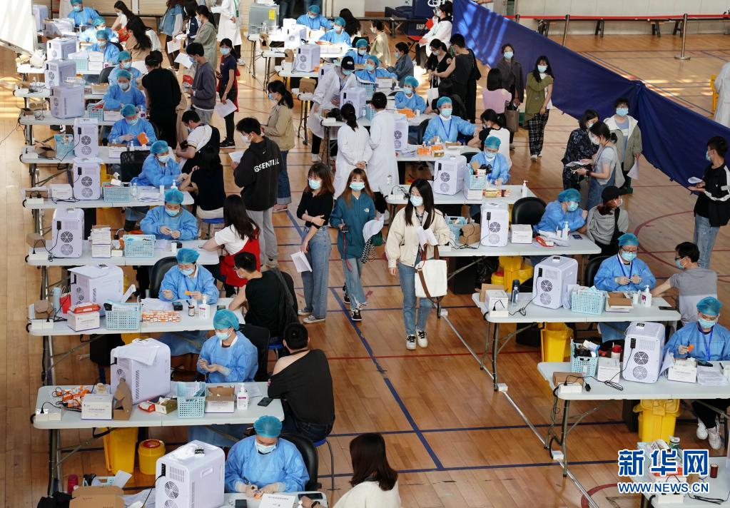 2021年3月28日,在華東師范大學(xué)閔行校區(qū)體育館內(nèi),師生們?cè)诮臃N新冠疫苗。新華社記者 劉穎 攝