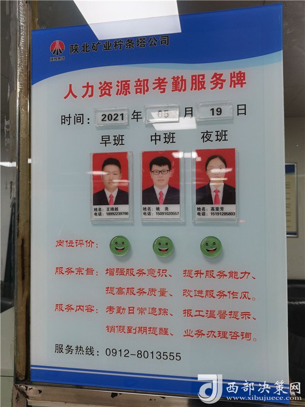 西部決策網(wǎng)訊 在黨史學(xué)習(xí)教育活動(dòng)中,開展“我為群眾辦實(shí)事”實(shí)踐活動(dòng)是公司黨史學(xué)習(xí)教育實(shí)施方案中的一項(xiàng)重點(diǎn)任務(wù)。為及時(shí)了解和掌握員工考勤動(dòng)態(tài),妥善處理和解決好員工考勤中的難點(diǎn)問(wèn)題,增強(qiáng)員工獲得感、幸福感、安全感,陜北礦業(yè)檸條塔公司人力資源部結(jié)合實(shí)際,把學(xué)黨史與為員工辦實(shí)事相結(jié)合,增設(shè)一面“考勤服務(wù)牌”。