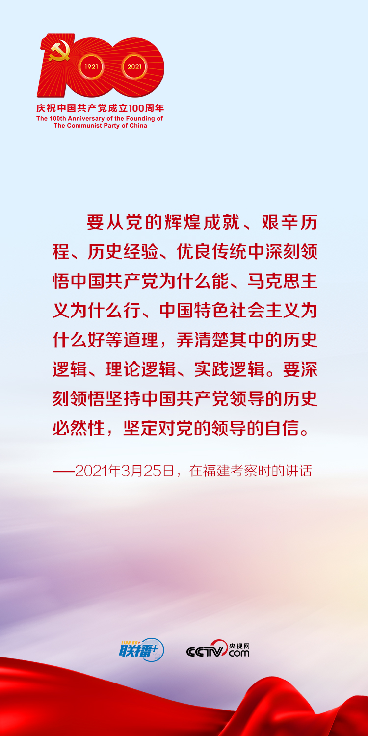 今年是中國共產(chǎn)黨成立100周年。央視網(wǎng)《聯(lián)播+》特梳理總書記關于知史愛黨的重要論述,與您一起堅定理想信念,不斷增強守初心、擔使命的思想自覺和行動自覺。