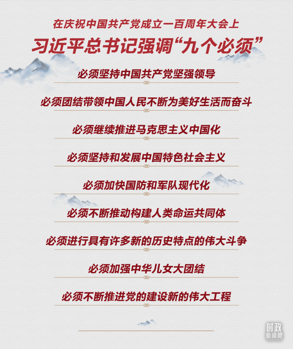 在7月1日的慶祝中國共產黨成立100周年大會上,習近平強調,我們要用歷史映照現(xiàn)實、遠觀未來,從中國共產黨的百年奮斗中看清楚過去我們?yōu)槭裁茨軌虺晒?、弄明白未來我們怎樣才能繼續(xù)成功。以史為鑒、開創(chuàng)未來,總書記提出“九個必須”,并作出許多新論斷、新表述。