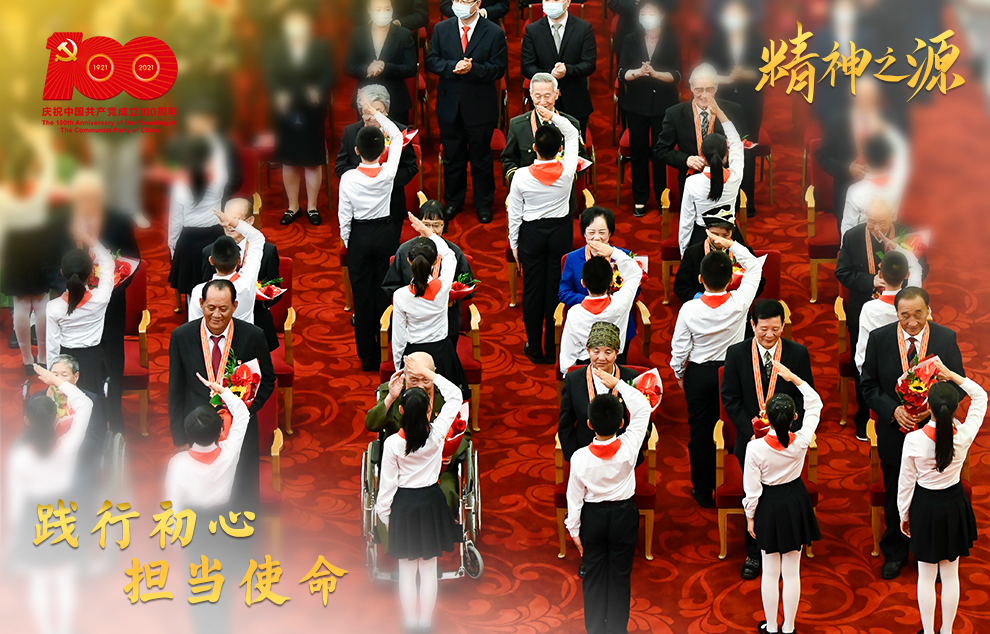 6月29日,慶祝中國共產(chǎn)黨成立100周年“七一勛章”頒授儀式在北京人民大會堂金色大廳隆重舉行。這是少先隊員向勛章獲得者獻花,敬禮致意。