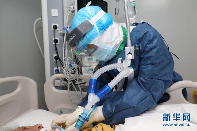 海軍軍醫(yī)大學(xué)第二附屬醫(yī)院急診、重癥醫(yī)學(xué)科護(hù)士長陳靜在武漢火神山醫(yī)院為患者進(jìn)行氣管插管后的導(dǎo)管固定(2月19日攝)。新華社發(fā)(陳晨 攝)