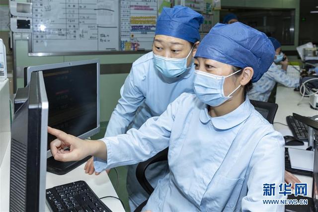 海軍軍醫(yī)大學(xué)第二附屬醫(yī)院急診、重癥醫(yī)學(xué)科護(hù)士長陳靜(右)通過監(jiān)控查看病人情況(8月5日攝)。新華社發(fā)(汪輝 攝)