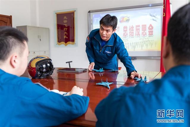 空軍航空兵某旅副參謀長姚凱(中)在大隊(duì)講評室給年輕飛行員講述對抗空戰(zhàn)比武中的經(jīng)驗(yàn)教訓(xùn)(2018年9月14日攝)。新華社發(fā)(張皓陽 攝)