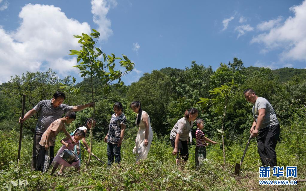 姚祖元(右一)與家人一起種樹(2019年7月13日攝)。在秦嶺深處的陜西省漢中市留壩縣火燒店鎮(zhèn),姚家5代人歷時70年深耕秦嶺的故事在當(dāng)?shù)丶矣鲬魰?,傳為佳話?nbsp;新華社記者 陶明 攝