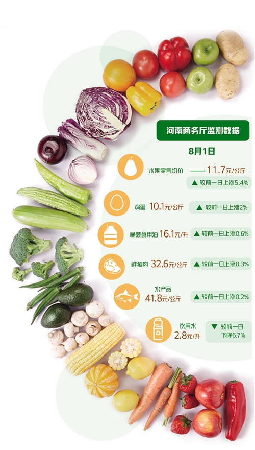 據(jù)了解,河南省商務(wù)廳自7月21日起便啟動了生活必需品市場監(jiān)測日報,對河南全省220家樣本企業(yè)、11個大類、72個品種商品實施監(jiān)測。8月1日監(jiān)測數(shù)據(jù)顯示,72個品種較前一日相比呈現(xiàn)“36漲14平22降”。分大類看,水果零售均價為11.7元/公斤、雞蛋10.1元/公斤、桶裝食用油16.1元/升、鮮豬肉32.6元/公斤、水產(chǎn)品41.8元/公斤,較前一日分別上漲5.4%、2%、0.6%、0.3%、0.2%;飲用水2.8元/升,較前一日下降6.7%;糧食5元/公斤、蔬菜5.7元/公斤,與前一日持平。
