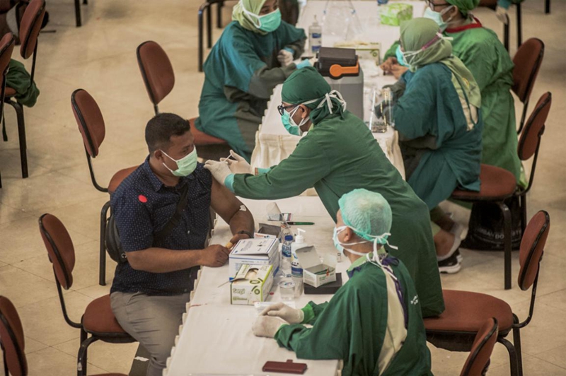 1月28日,一名醫(yī)務(wù)工作者在印度尼西亞日惹接種中國(guó)科興公司的新冠疫苗。新華社發(fā)(蘇普里揚(yáng)托攝)