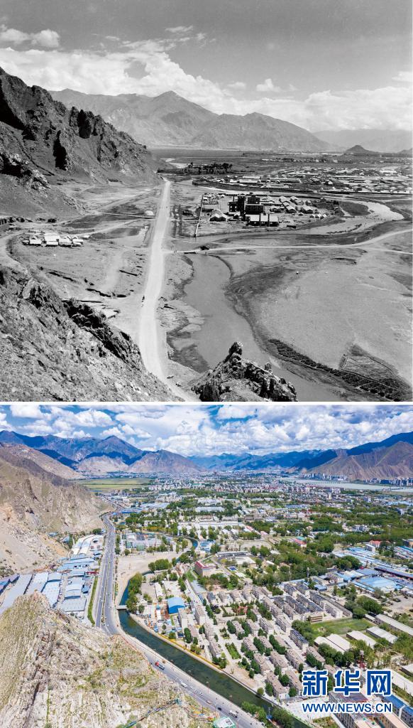 拼版照片:上圖是20世紀50年代拍攝的拉薩市景象(新華社發(fā) 藍志貴攝);下圖是2021年8月13日拍攝的拉薩市新貌(接片,新華社記者孫瑞博攝)。新華社發(fā)