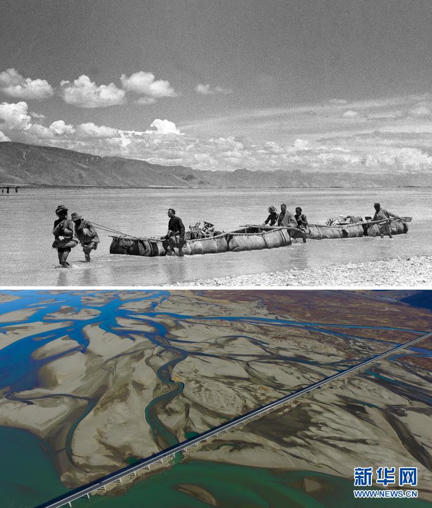 拼版照片:上圖是20世紀50年代,雅魯藏布江上游的牛皮船載著土特產和糧食沿江運輸至西藏東部(新華社發(fā) 趙奇攝);下圖是2016年12月11日拍攝的位于西藏山南市扎囊縣境內的扎囊特大橋(新華社記者普布扎西攝)。新華社發(fā)