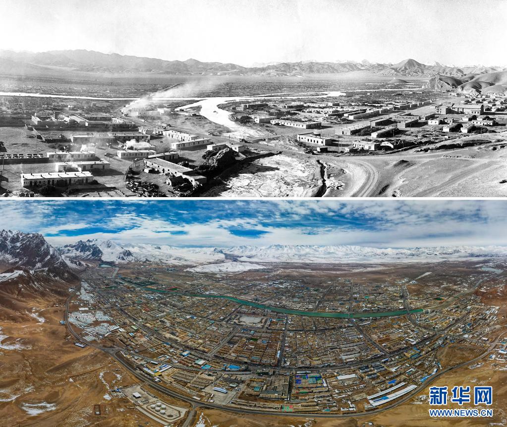 拼版照片:上圖是20世紀70年代的阿里獅泉河風貌(新華社記者徐邦攝);下圖是2021年5月21日拍攝的阿里獅泉河鎮(zhèn)新貌(新華社記者孫瑞博攝,無人機全景照片)。新華社發(fā)