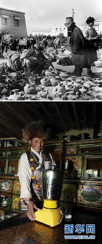 拼版照片:上圖是20世紀50年代,拉薩居民購買酥油茶壺(新華社記者任用昭攝);下圖是2011年12月12日,西藏日喀則拉孜縣吉角村村民倉決用電動酥油茶攪拌機給家人打酥油茶(新華社記者普布扎西攝)。新華社發(fā)